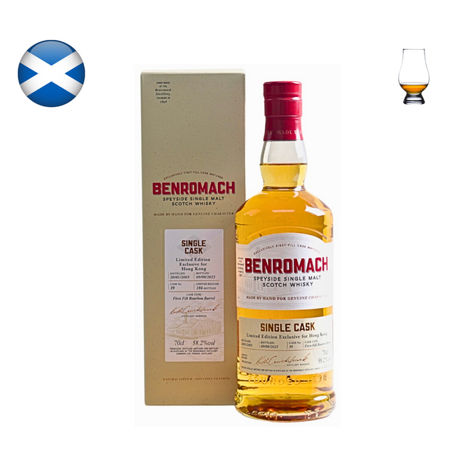 The Benromach 2003 Limited Edition, a special release for Hong Kong. Distilled on January 20, 2003, and bottled on August 9, 2023, this whisky comes from Cask No. 39, with only 186 bottles available.
