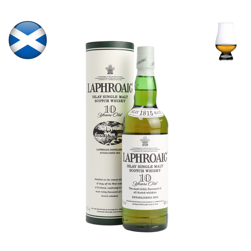 Laphroaig 10 is a smoky and full-bodied Islay peated single malt whiskey. It's distilled following 200-year-old traditions and aged for 10 years in ex-Bourbon barrels. Enjoy its unique flavour profile of salty seaweed notes and lingering sweetness either neat or over ice.